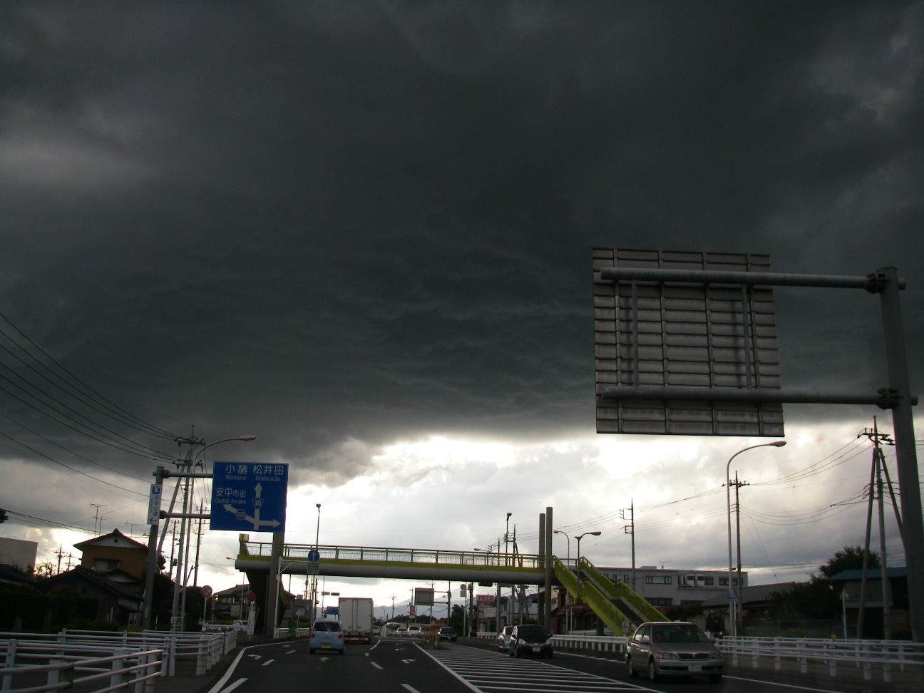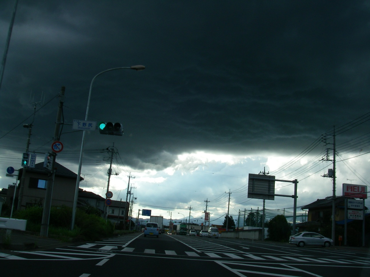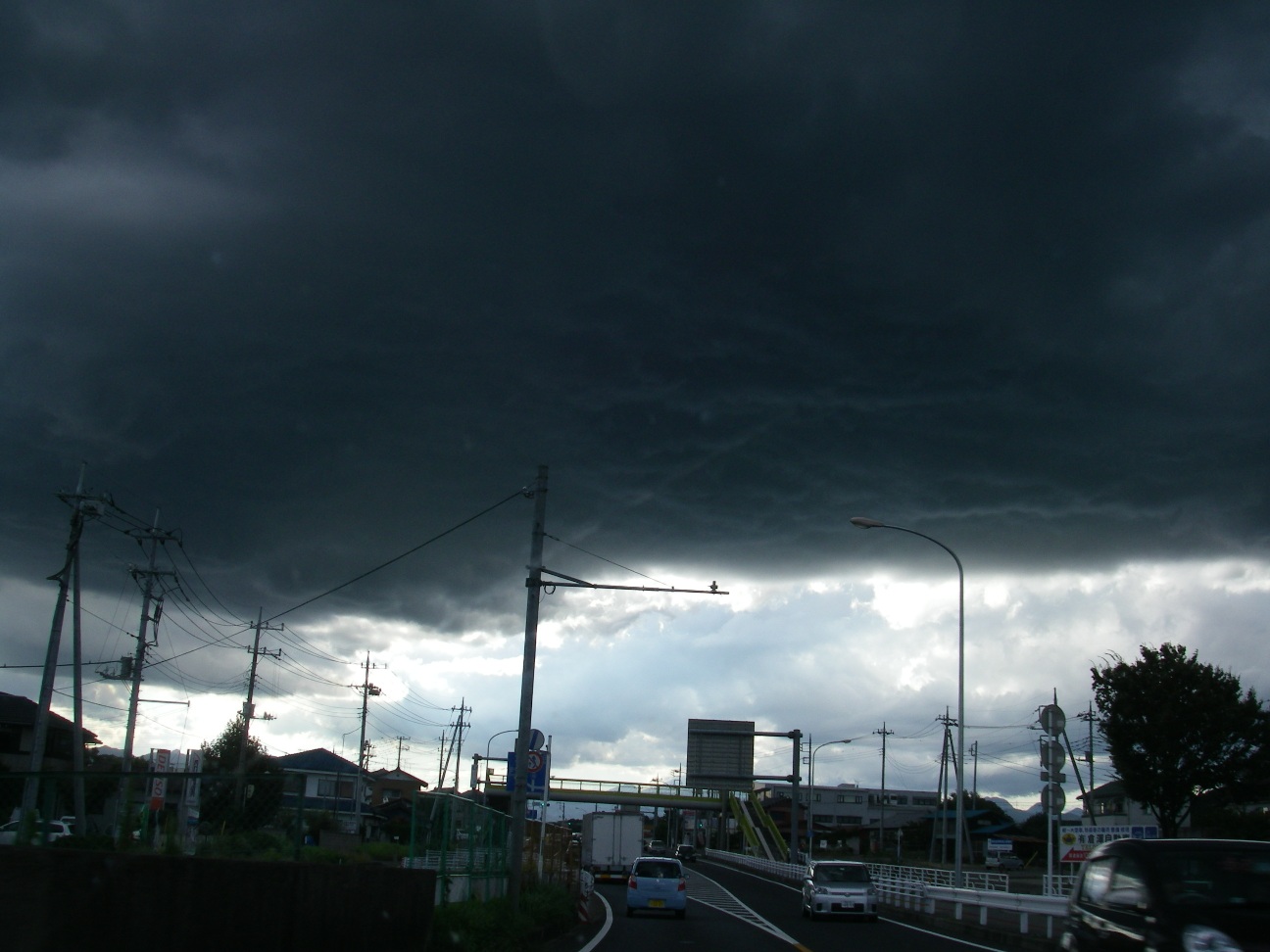 2011年9月23日(金曜日)午後4時に、群馬県安中市内の18号線を長野県に向かって車で通過中に、絵本に出てくるような真っ黒な雲の下に来ました。 助手席の妻(暁子さん)が撮った写真が次の画像です。 残暑が18日まで続き、その後19日から3日間、台風15号が接近し上陸して通過し、22日に台風が北に去った後、大陸から冷たい気流が流れ込み、 この23日に一時的な冬型の気圧配置になったときの上空の模様でした。この撮影の10分後に弱い俄雨にわかあめがありました。 なお、前日22日に北海道大雪山系で初冠雪、24日に富士山も初冠雪となっています。