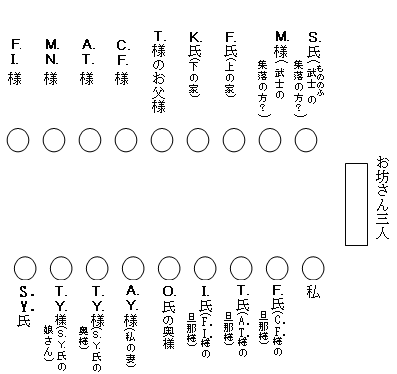 次の米山サービスエリアにてガソリン補給。米山は7合目から上は残雪あり。ここで、トイレ大。喪服に着替える。A様のお話では、外で着替えたので、近くの観光バスの皆が見ていた由。上越市駒林に着いたのが10時40分。Ssrさんが、丁度良い時間に着いたといって既に親戚一同集まっている部屋へ案内して下さる。従兄弟のお姉様方や旦衆も居られた。11時から、お坊さん3人で法要始まる。法事は始めて。Ki様の30日目の法要。皆にお経のコピー渡されて,メインの恰幅の良い少し若いお坊さんの読経と唱和して皆で声を出してお経を読むのだ。この坊さんは声が綺麗で声量があり、イタリアのオペラでも出来そうな感じ。法事が終わり、コピーは回収された。暑くて汗をかく。その後、マイクロバスで高田の中心近くの寿司店「福寿司」の2階でお坊さんの慰労会がある(席次は下図のとおり)。