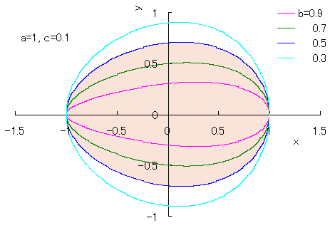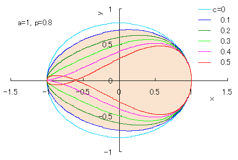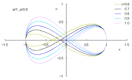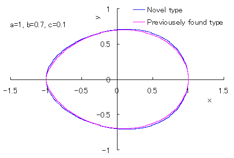 また、図1のうちの1個の曲線を得るための C++ プログラムはこちら です。このプログラムで、定数 , の数値を変えることにより曲線の形を変えることができます。 次に、 C++ システム・ファイル上の「ファイル」の中の「新規作成」をクリックすると、編集画面が現れますが、この画面に上記コピーしたプログラムを貼り付けます。場合によっては編集も行います。そして、「ビルド」をクリックすると実行ファイルが作成されます。さらに、「実行」をクリックすることにより、上記どちらのプログラムでも、「egg_shaped_curve.txt」という名のテキストファイルが作られて、計算されたデータ(卵形曲線上の各 x-y 座標点の座標データ)が格納されます。 次に、このテキストファイルに格納されたデータをエクセルファイルに移し変えます。それには、エクセルファイルの「外部データの取り込み」機能で行います。ただし、ここに紹介した計算プログラムの場合、テキストファイルに保存されるデータ間の仕切りはカンマ(,)で指定してありますので、「外部データの取り込み」にはこれを選択します。 最後に、エクセルファイルに移された各列の x-y 座標データ全てをドラッグした後に、エクセルファイルにある「グラフ ウィザード」をクリックして、その中の「散布図」を選び、スムーズなカーブになる絵図をクリックすると卵形曲線が描かれます。
