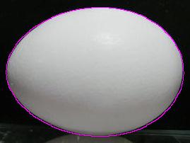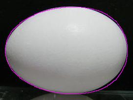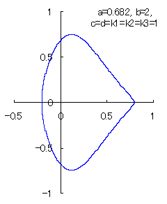 a=0, b=2.0, c=2.65, d=k1=k2=k3=1 の場合と現実の卵との比較を図4に示します。ただし、パラメータ値 c は、図1のときより少し変えています。図4を見て分かるように、凹形ひずみ円の変形から作られる卵形曲線は、現実の卵の形とかなりよく一致しているようです。