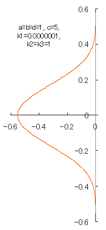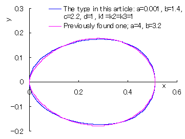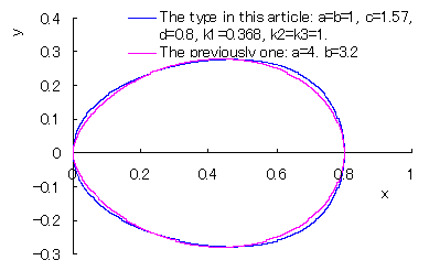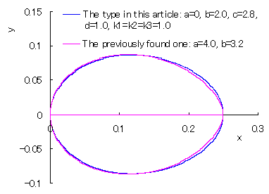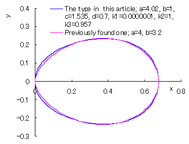 (5)式をコンピュータで計算させて、最も現実の卵の形に近い形を追求した結果、 の場合、 の場合、および、その他の場合の3例をグラフに表すと,それぞれ、図5、図6、および、図7の青色カーブのようになります。ピンク色のカーブは、比較のため、以前に見つけた卵形曲線を示します。このように、広範囲のパラメータ値にわたって卵形曲線が存在します。