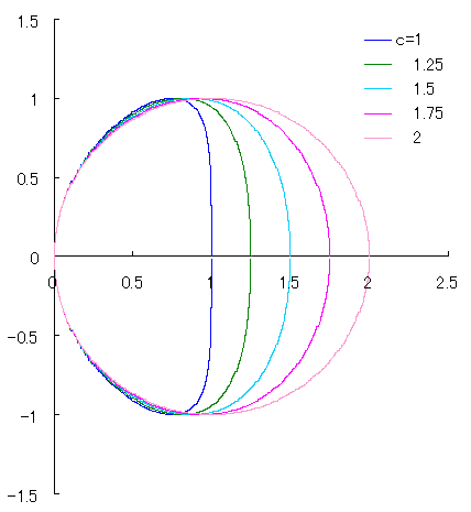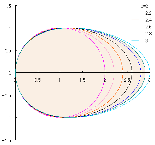 このプログラムで、定数 , の数値を変えることにより曲線の形を変えることができます。
