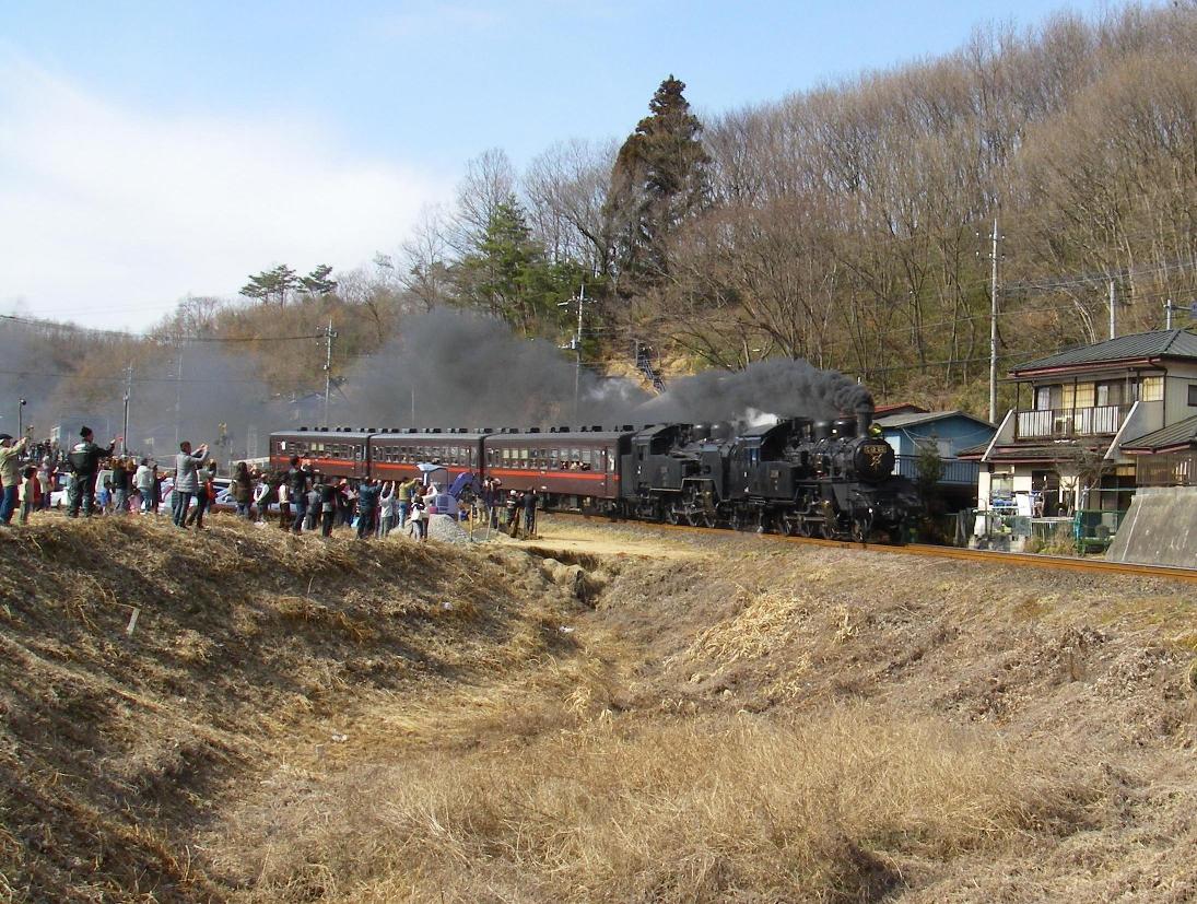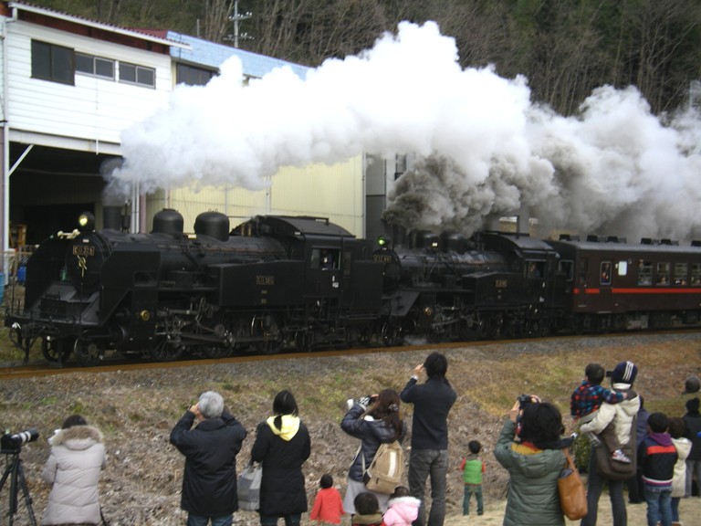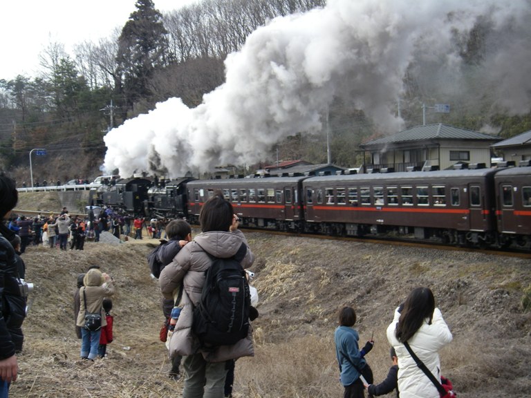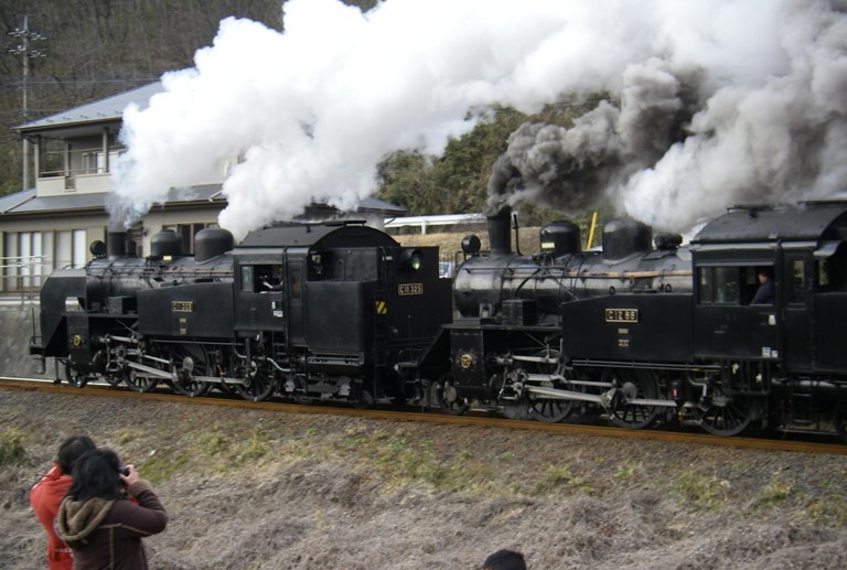の速さから見ると、それ程でもないかな。車窓の景色がビュンビュン後ろに飛んでゆく程ではないのには、ややがっかりでした。瞬間最高速度で時速90キロ位?。高速走行時の蒸気機関車はそれほど煙を出しません。このときの蒸気機関車の音は、シュルシュルシュルシュルシュル・・・。