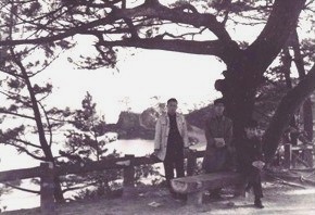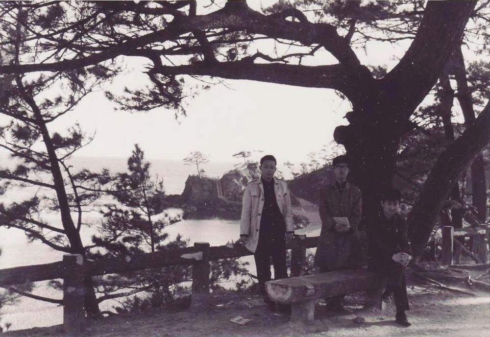 右から順に、舛岡富士雄氏、同級の山本信雄、 続いて、同級の青木秀明氏(後に松下電器産業㈱)。 同級の浅見誠治氏が撮影。 |