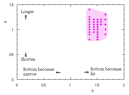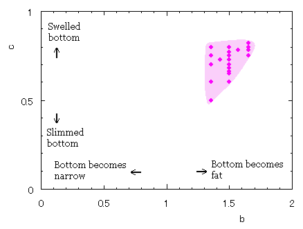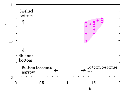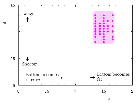 in which a heart curve may be found Herein, pink colored area represents its region, and dark pink colored dots represents data points which are obtained when heart curves are displayed as above. Herein, nearly fixed in the range of from 0.95 to 0.98. |