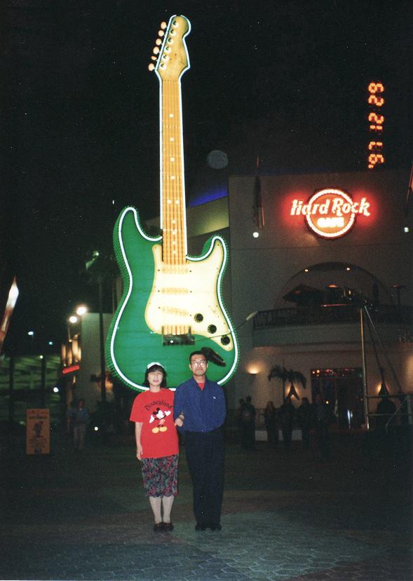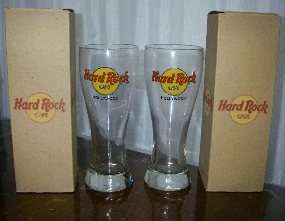 2階の奥の席に座ってゆっくりしていると、斜め後ろの席に座っていた白人青年の3人グループの1人が、「ハーイ!」と座ったままこちらを見て 親しげに声を掛けてきます。ああ、そうだ。さっき、ユニバーサルスタジオの超満員の巡回トレインに乗ったときに、斜め直ぐ後ろに座っていた若い人だ。 また会ったな。私も「ハーイ!」と返しました。僕たちを日本人と思っていないような感じだった。 特大ビックリのビーフステーキとこれまたすごいボリュームのフルーツサンデーを「美味しい、おいしい」と平らげました。 すると、最初から私たちを給仕していたごっつい体つきの黒人が2個のボール箱を持ってきて、 いま飲み干したばかりのフルーツパフェが入っていた大きなグラスを、そのボール箱に詰めるではありませんか。 ガラスの内側に付いている飲みかすをそのままに。 そして曰く、「これを差し上げます。どうぞ持って行ってください。」(勿論、英語で) イヤー。私たちはビックリ仰天で、汗びっしょり。恐縮と嬉しさの入り混じった複雑な気持ちで1階に下りて会計を済ませました。 なぜ、プレゼントされたのだろう? 新婚さんだと分かったのかな。イヤ、新婚さんなら他にもたくさんいるに違いない。 ハリウッドの、否、日本から来た俳優と女優と勘違いされたのか?(それはないな。)?? お店のオーナーが給仕に指示なさったのか、給仕の方が実はこのお店のオーナーだったのか。今でも思い出していろいろ考えています。 その後、ハードロックカフェ・ハリウッド店の現在のメニューを見るとデザートの一部に下記の赤字で示したように、 追加料金でグラスをキープできると書かれています。 私たちもいつの間にか追加料金で購入したことになっていたのかもしれません。 しかし、当時ハードロックカフェ・ハリウッド店に 販売用の諸グッズは見当たらなかった、と妻が言います。 Hot Fudge Sundae A regular portion of Haagen-Dazs vanilla ice cream, topped with hot fudge sauce, chopped walnuts, fresh whipped cream, chocolate sprinkles and a cherry. Put it in a souvenir Martini glass and keep it for an additional fee. その戴いたグラスと箱が右上の画像です。大変よい形をしています。グラスの丈は21.5センチもあります。 この画像のように、グラスには Hard Rock CAFE と HOLLYWOOD のロゴが印刷され、箱には Hard Rock CAFE とだけ印刷されています。 いずれにしても記念となりました。あの親切な黒人の給仕さん、有難うございます。 レジで支払った金額はお料理相当にしては案外安かったので、その金額以上の物を戴いてしまった、という感覚でした。 |