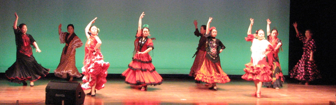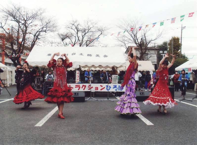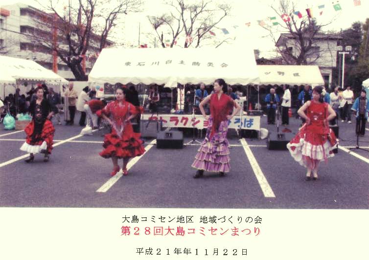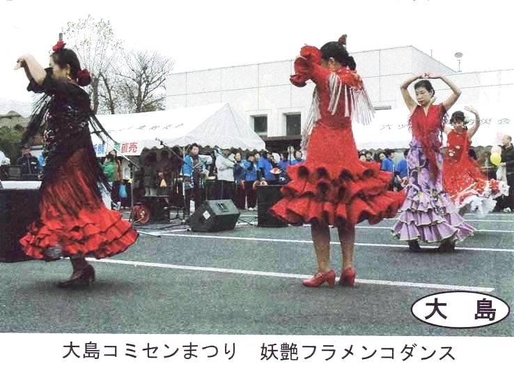 山本(旧姓 仁藤)暁子さんは、2009年に、茨城県ひたちなか市大島コミュニティーセンター (約して、大島コミセン)でのフラメンコ・ストレッチ講座に参加して半年、 駆け出しのまま、2009年11月22日(日)に公民館祭りでそれを披露しました。それが思いもよらず、ひたちなか市市民憲章推進協議会が発行し 市民全所帯に配布される「わがまち」第38号にその写真が掲載されました。それが左下の画像です。 暁子さんは一番左端で、先生はその右です。 なお、先生は、ひたちなか市のフラメンコ教室「Santa Maria La Blanca」(サンタ・マリア・ラ・ブランカ)の 小池美結季先生 (その2) です。 中の画像は大島コミセンの職員の方が撮影し、右はダンサーの1人のお友達が撮影されたそうです。 |