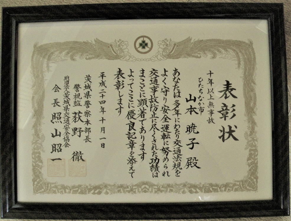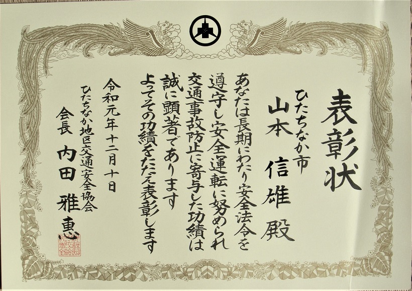 私(信雄)も、遅まきながら、市報だよりを見て2019年9月にひたちなか警察署に申請し、2019年12月10日に次の賞状を頂きました。多くの人は申請すれば表彰されることを知らないで過ごしているようです。貰えるものは貰っとこうっと。 |
