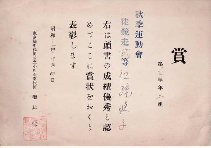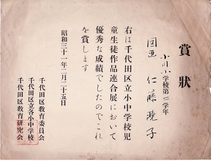 ついでに、暁子様の小学校時代の賞状がありました。 |