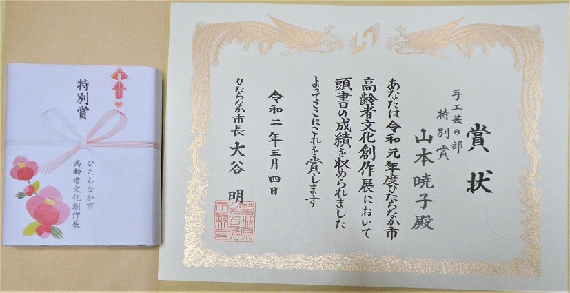 2020年3月上旬に開かれる筈であった「ひたちなか市高齢者文化創作展」に暁子様がペインティングを出品し、特別賞を授かりました。「開かれる筈」と書いたのは、新型コロナウィルスの感染を防ぐため、展覧会は中止となったからです。授賞式も中止となり、作品の搬出の時に直接、係員から賞状と記念品が渡されました。この新型コロナウィルスの世界的パンでミックスの影響で、2020年7月と8月に開かれる東京オリンピックは延期となることが2020年3月24日夜に決定されました。 |