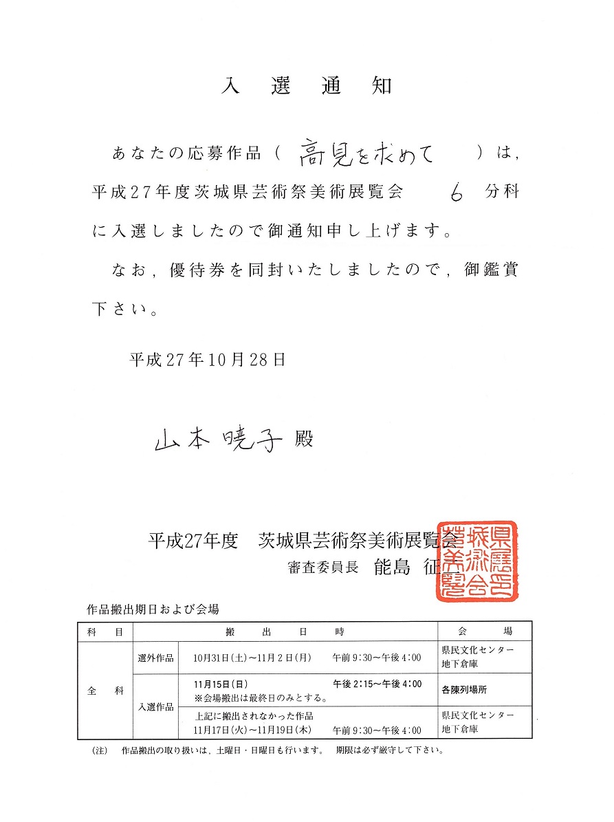 7. 平成27年(2015年)度の第50回茨城県芸術祭美術展覧会(県展)写真の部で入選しました