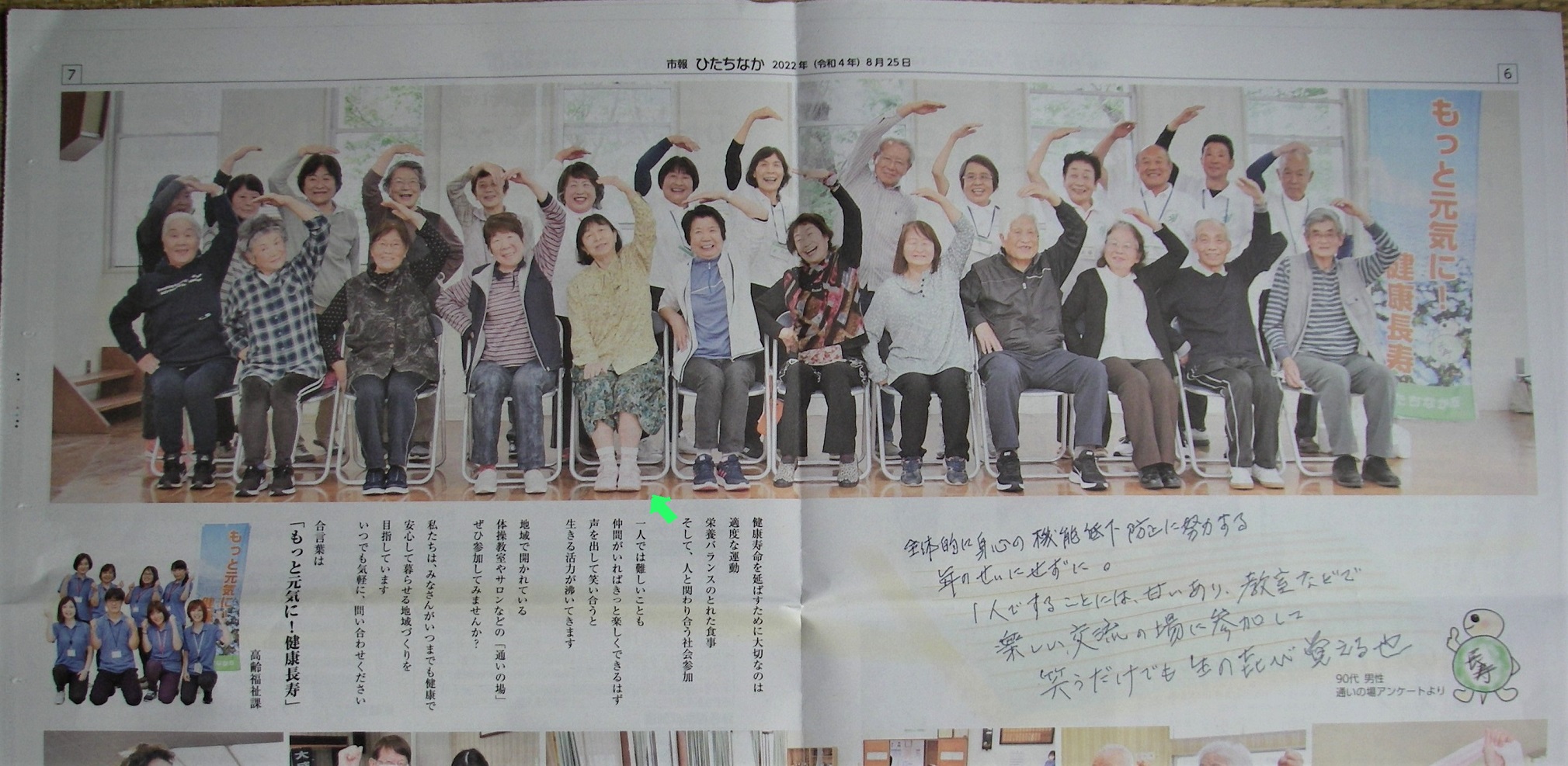 茨城県ひたちなか市企画調整課が企画した2022年度 シルバーリハビリ体操 が、前渡コミュニティセンターにも開催され、山本暁子さんが参加しました。このときの参加メンバーの大きな写真が市報ひたちなかに掲載されました。それを次に示します。 |