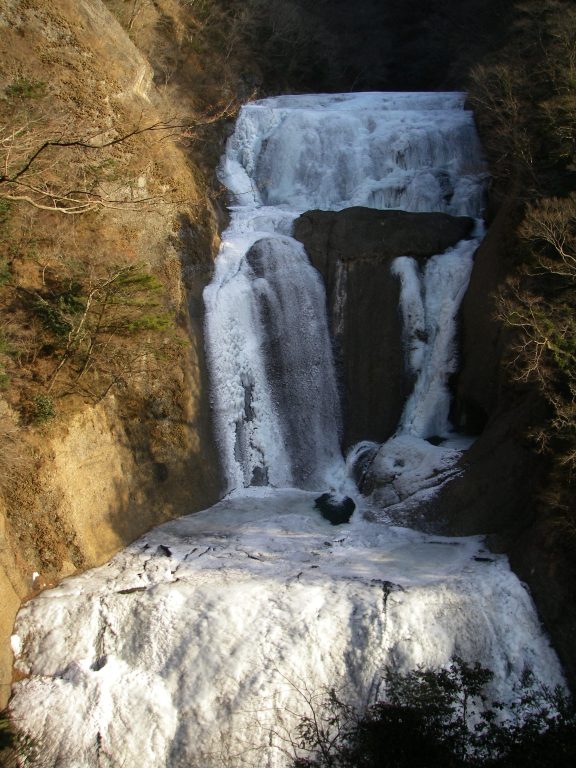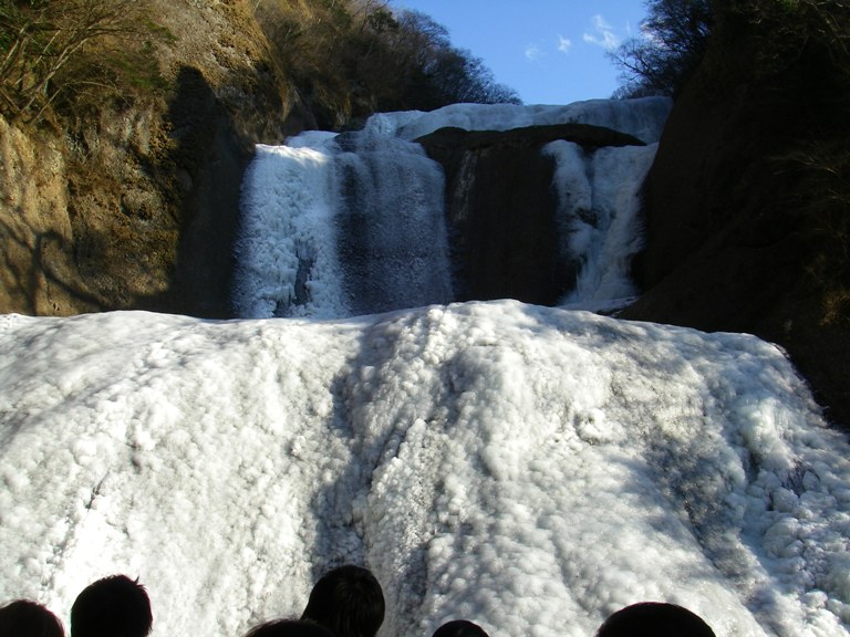 2012年の1月は寒い日が続き、雪国ではかつての豪雪に次ぐ積雪。茨城県の袋田の滝も完全凍結したというニュースに2月4日(土)に見物に行きました。 が、この日は寒さがやや緩み、滝の氷はやや溶けていました。 |
