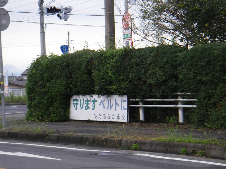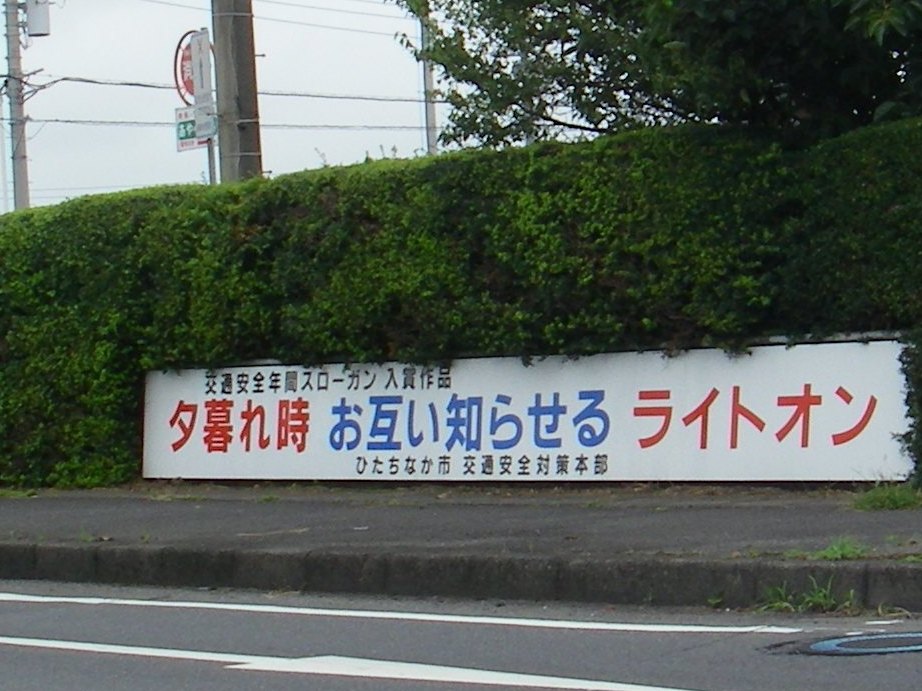 茨城県ひたちなか市田彦の下田彦南交差点で国道6号線と交差する市道に私の好きな交通標語の看板の残骸が、下左の写真のようにあります。2016年春の強風で半分飛ばされてしまい、半分がそのまま残ったわけです。この道路は1970年代に新設され、定かではありませんが、そのころから看板が設置されていたのではないかと思います。
