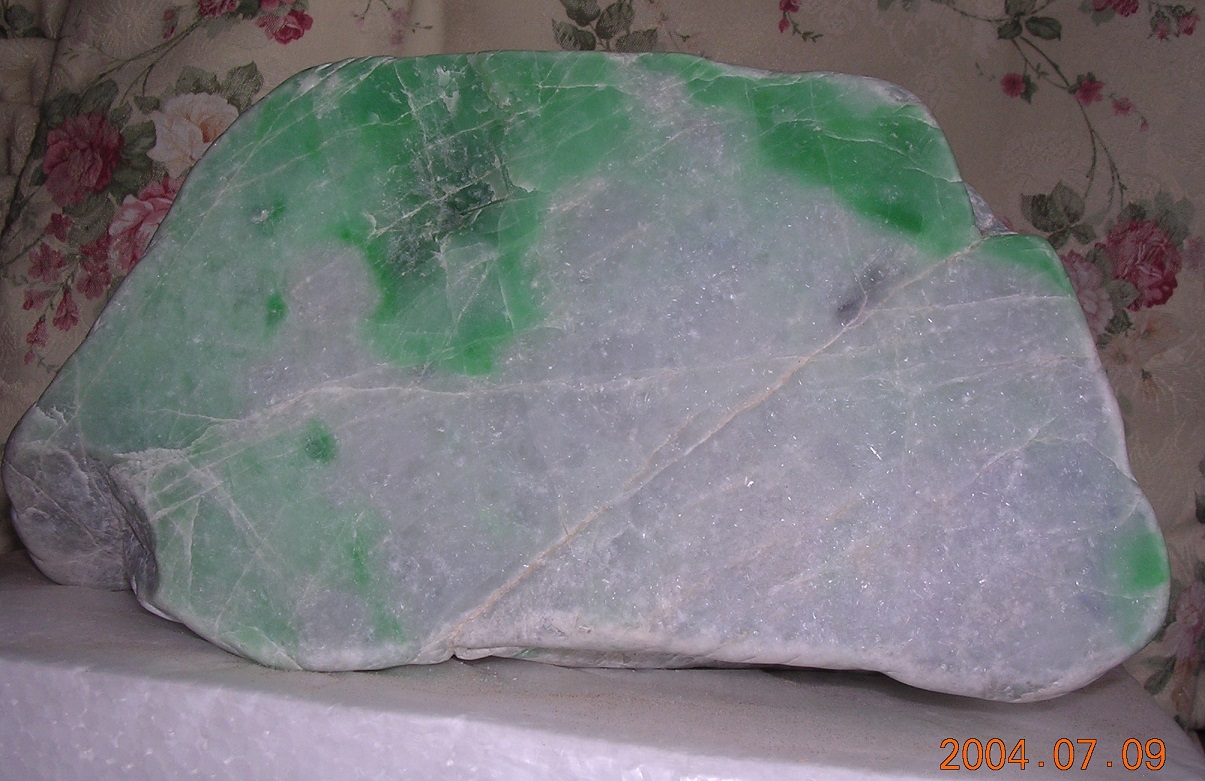 上記の少し前の2003年8月上旬、福井大学に用事に出かけた途中で新潟県糸魚川に寄って、小滝川のヒスイ峡に同行の高専専攻科学生を案内したときに、そこにあるおみやげもの屋でビルマ産のきれいなヒスイを見付けてしまったのです。このおみやげ屋には、今まで何回か訪れていますが、買おうと思ったことはありませんでした。今回だけは気になって落ち着かず、大目をつぶって買ってしまいました。その様子が日記に残っていましたので次に記し、そのヒスイの大塊を下の画像に示します。