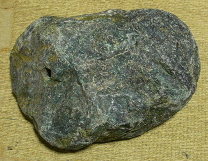 私の両親は新潟県上越市出身です。1970年頃に父が所有していた新潟県の民族史・自然史の本を、たまたま、私が当時の大阪在住の父の住居に帰省していたときに見付け、その中には糸魚川のヒスイのことが詳しく書かれていました。それまで私はこのことを全く知りませんでしたが、小学生のころから、鉱物や化石をたまたま見つけたときに採集するなどの小さな趣味は持っていましたので、大阪と仙台の行き来の途中でもある糸魚川に寄って、姫川で1人ヒスイを探しました。この姫川、どの石も緑がかっていて、ヒスイとそうでない石との見分けが全くつきません。近くの人に聞くと、それは滅多に見つからず、緑がかった重い石はロディン岩などで、地元の人はキツネ石と呼ばれているそうです。夏に仙台から大阪に帰省するときに寄る程度なので、大きくて重くて物凄く硬い石を2個見付けたものの、ヒスイかどうかは分からないままで、今でも家に放置したままです。それ以外の石は採集していません。茨城県に就職した後、ある夏休みにたまたま思い出して姫川の河原を散歩していて、水辺の岩と大きな石の2メートルに積み重なった崖の途中に、色合いが周りと違う石を見付けたのが下の画像です。多分、これはヒスイに違いないとは思いましたが、後年、新潟県糸魚川市にあるフォッサマグナミュージアム の学芸員の先生に鑑定して頂きました。この先生がこの分野で有名な 宮島 宏 先生 (その2) (その3) だと思います。この鑑定の様子を日記に記してありましたので、それを次に書きます。