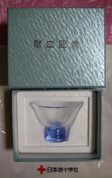 往年、献血に協力しまして、10回目に右図のような記念品を貰っています。ガラス製の小さなお猪口でしょうか。献血をして血を抜かれた直後の爽快感は絵も言われぬものです。国内では輸血用の血液がいつも不足しているようなので、皆様も協力されるとよいかと思います。 return |