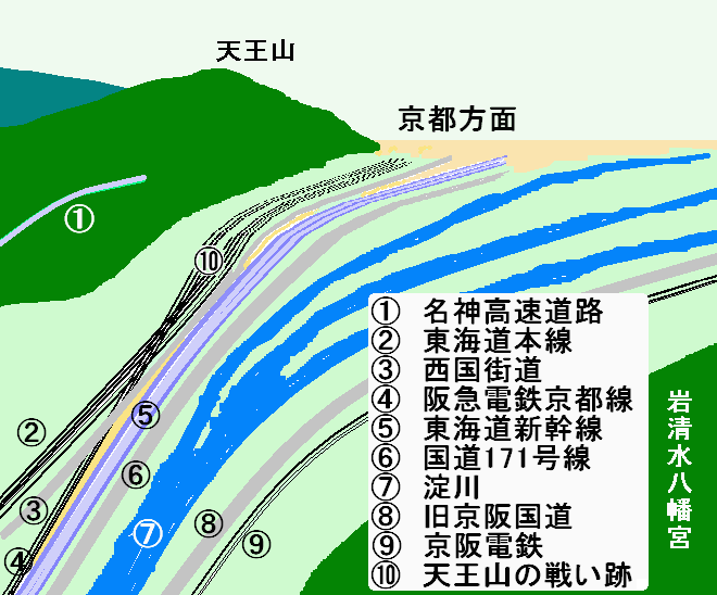 ありました。見当を付けた場所から見た景色は夢とほとんど同じでした。今までも正夢を見てきましたので、驚きよりはヤッパリという感じでした。その場所とは、岩清水八幡宮の境内の北はずれです。今までその場所を知らなかったのですが、このお陰で、歴史や古典文学で有名な岩清水八幡宮に来ることができました。向こうに見える山は天王山で、下に見える例の場所は、1582年に本能寺の変で織田信長に謀反を起こした明智光秀が、備中(岡山県西部)から急遽取って返した羽柴秀吉に天王山の戦いで敗れた場所です。