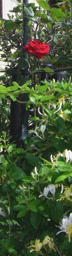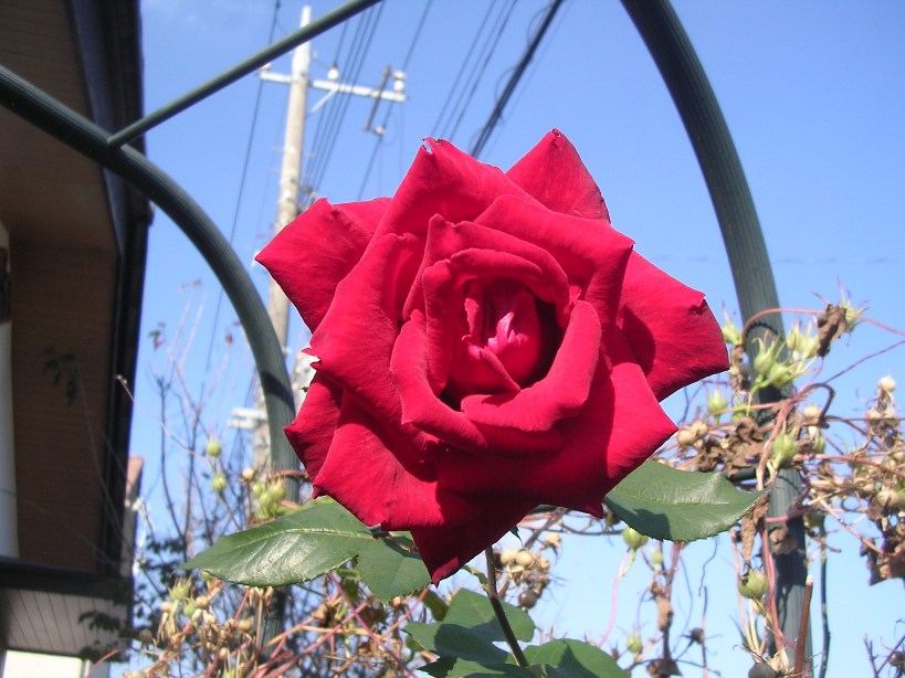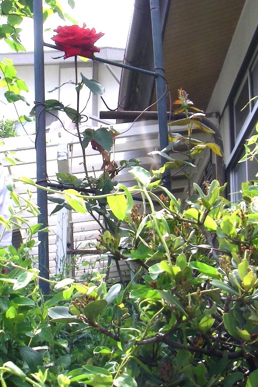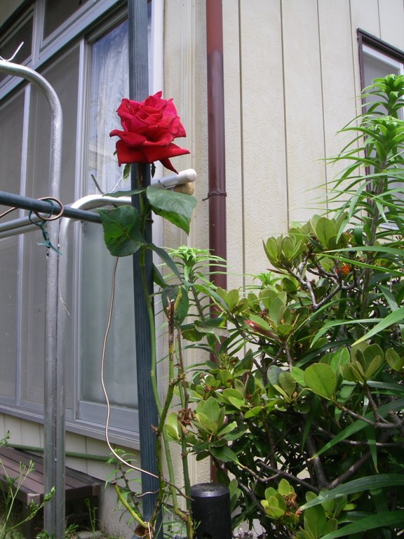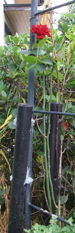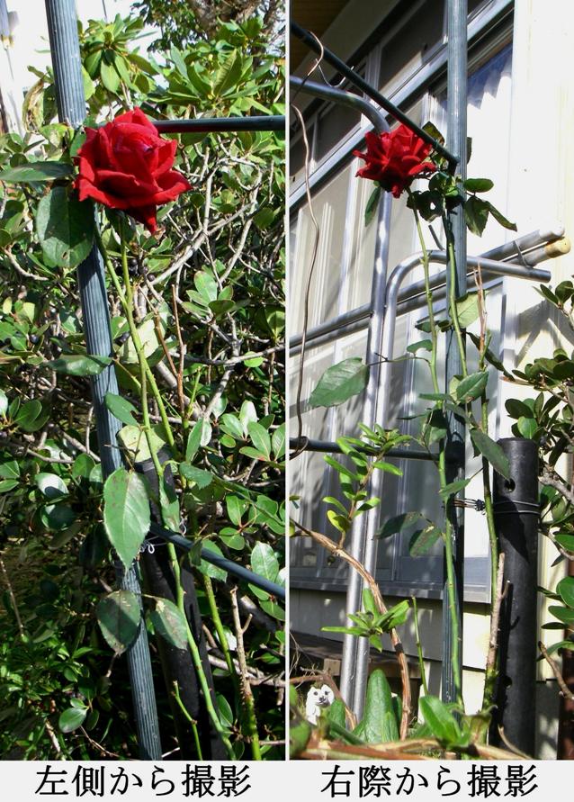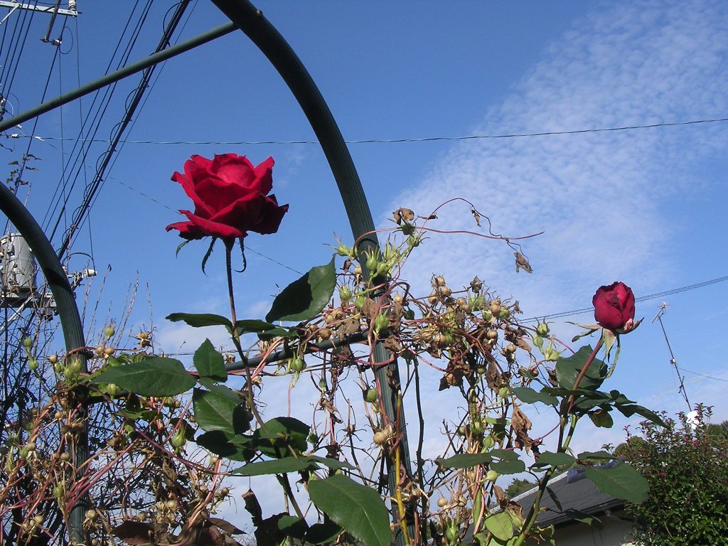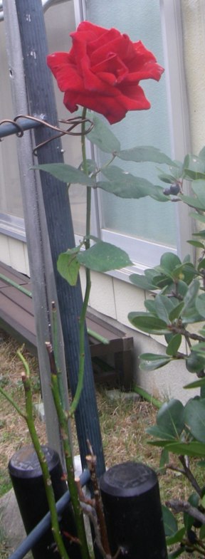 花を付ける枝は2本程度で、年によって、ある枝が枯れると、交代に別の新しい枝が出来る、という具合で、妻の暁子様が水戸市泉町の花屋さんで植木鉢として買って庭に移植して以来、20年経ちますが、一向に枝と花が増えることがありません。これは何の種類のバラなのでしょうか。花が散ると、間もなく葉も散ります。緑の枝だけが残ります。バラの木と言うよりはバラの草のようです。こんなバラを他に見たことがありません。育て方が悪いのでしょうか。しかし、花は綺麗でしっかりしています。10年以上前の若いときには、次の写真のように、一度に2,3輪咲いたこともありました。いつも不思議に思っているバラです。