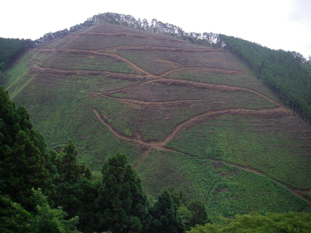 2015年6月18日(木)午後、茨城県大子町の広域農道アップルラインを通ったときに、山全体が伐採された風景が見られました。 |