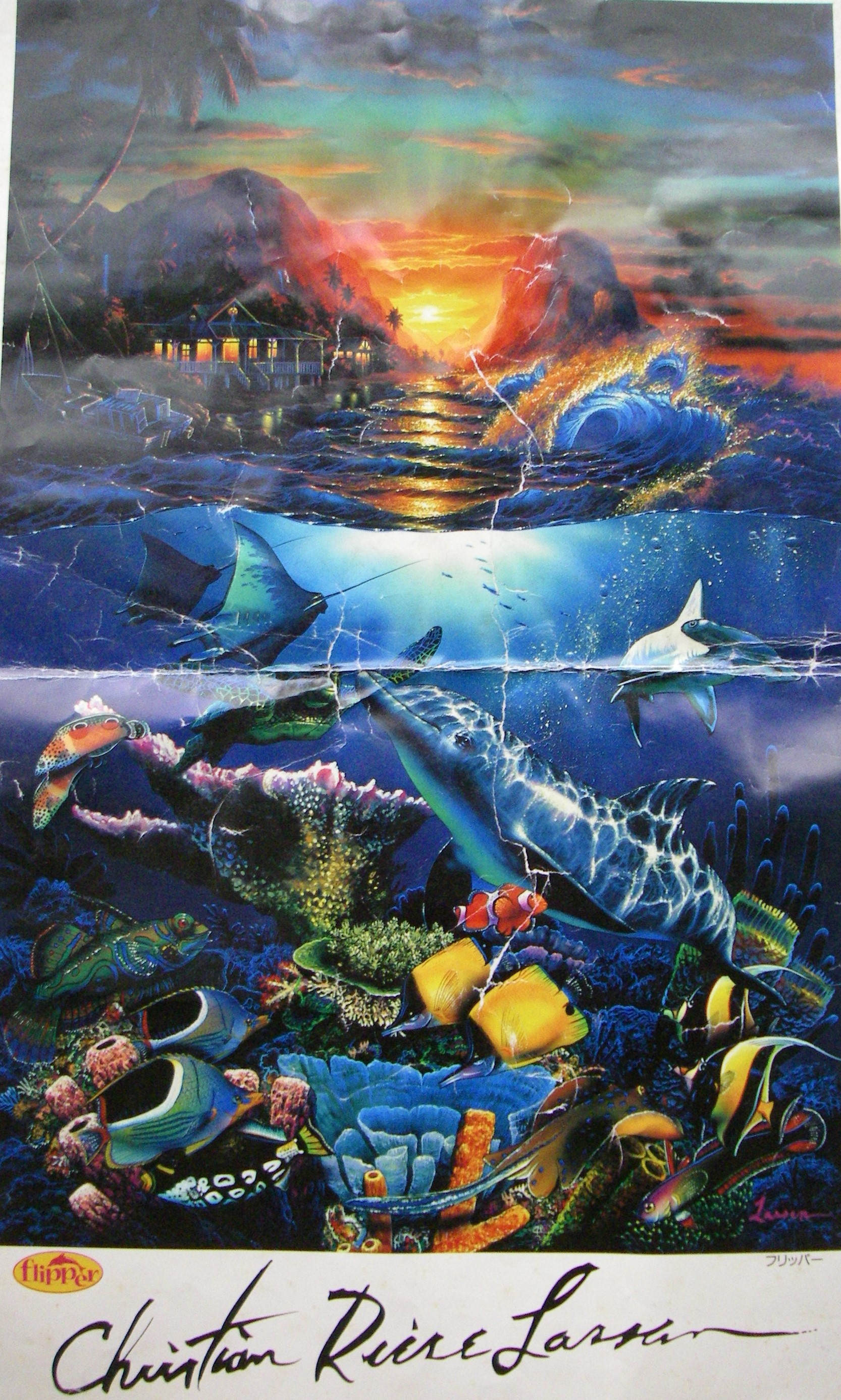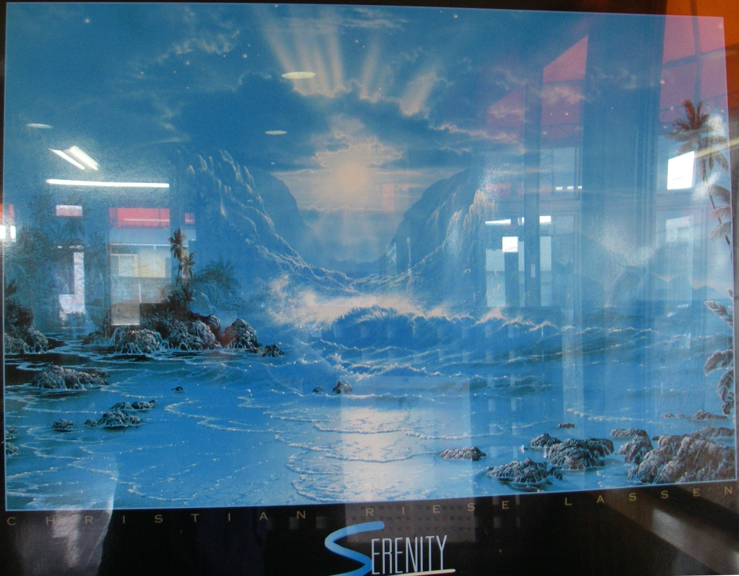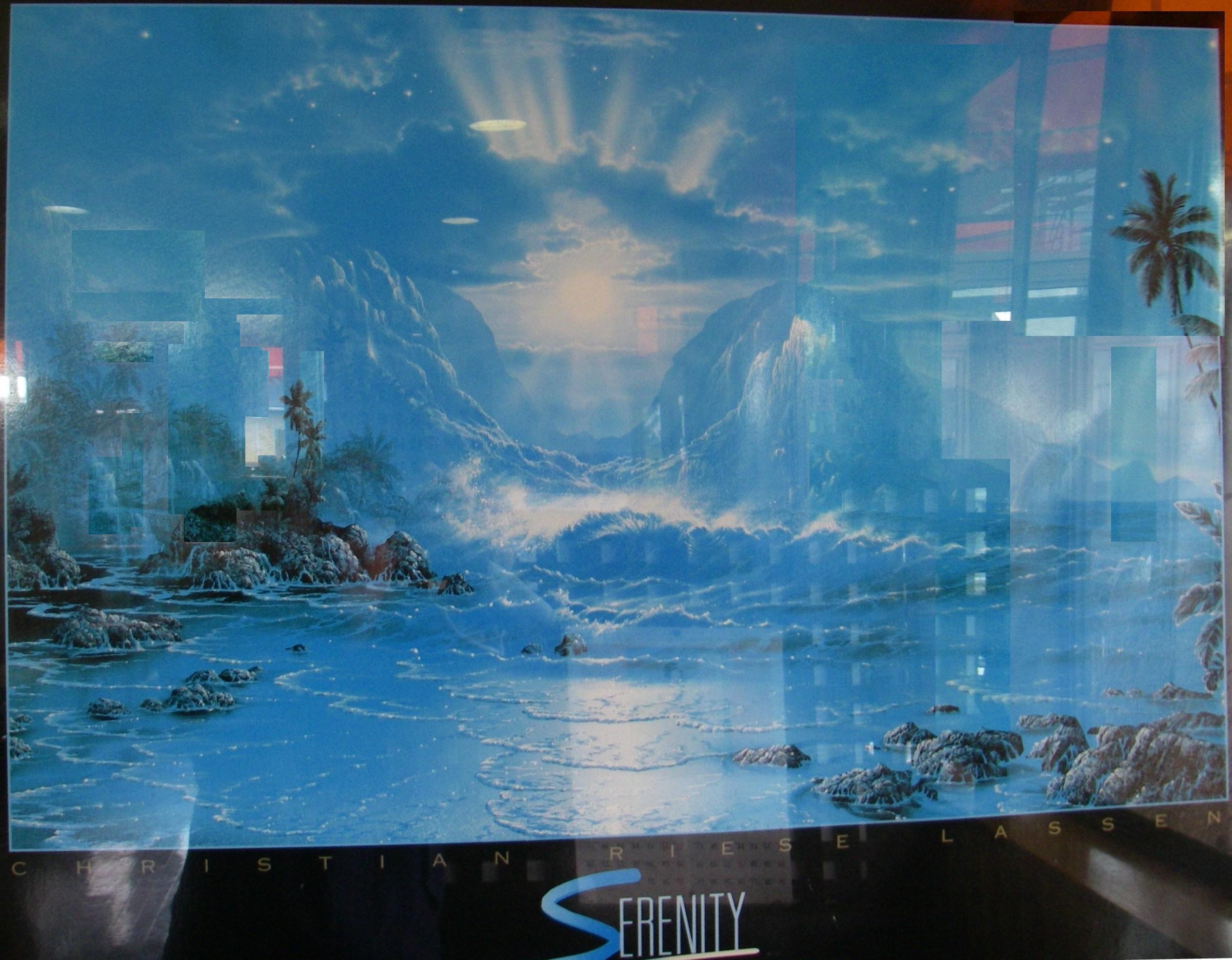 茨城県那珂市の「日本一ラーメン」というお店の奥のボックス席の壁に、下の写真に示すような大変幻想的なアートが飾られています。海外のアートです。日本人の感覚では到底生まれないような作品で、いくら見ても飽きが来ず、「どこかで見たような景色だなあ」という、ある種の懐かしさを抱いて見入ってしまいます。そこに描かれてある非現実的自然に入り込んで、その幻想的な自然を体験したくなります。作者は、カリフォルニア生まれでハワイ育ちの Christian Riese Lassen(その2) のようです。 残念ながら、下の写真には室内の電燈や外の光が反射して写り込んでいますので、作品がはっきりと写されていません。幸い、角度を変えて2つの写真を撮ってあり、左が生の写真の一つで、右がもう一つの写真を切り取って、左の写真の光っている個所に植え付けて、光っている所を出来るだけ無くするようにしたものです。 |