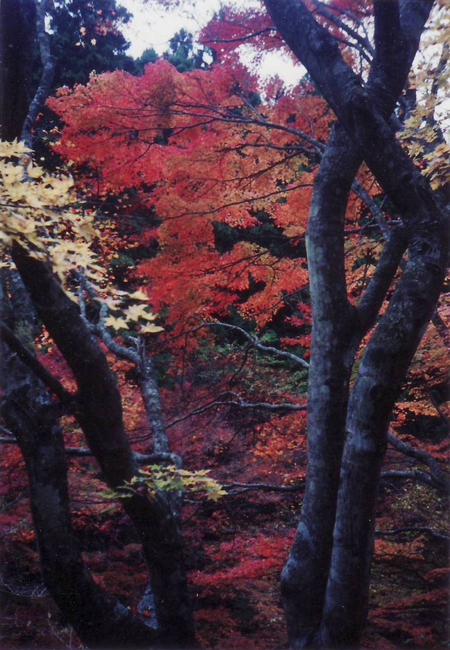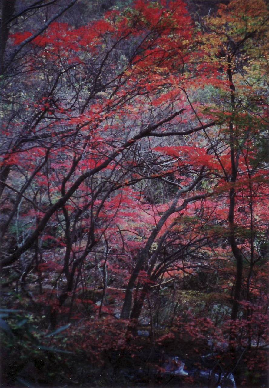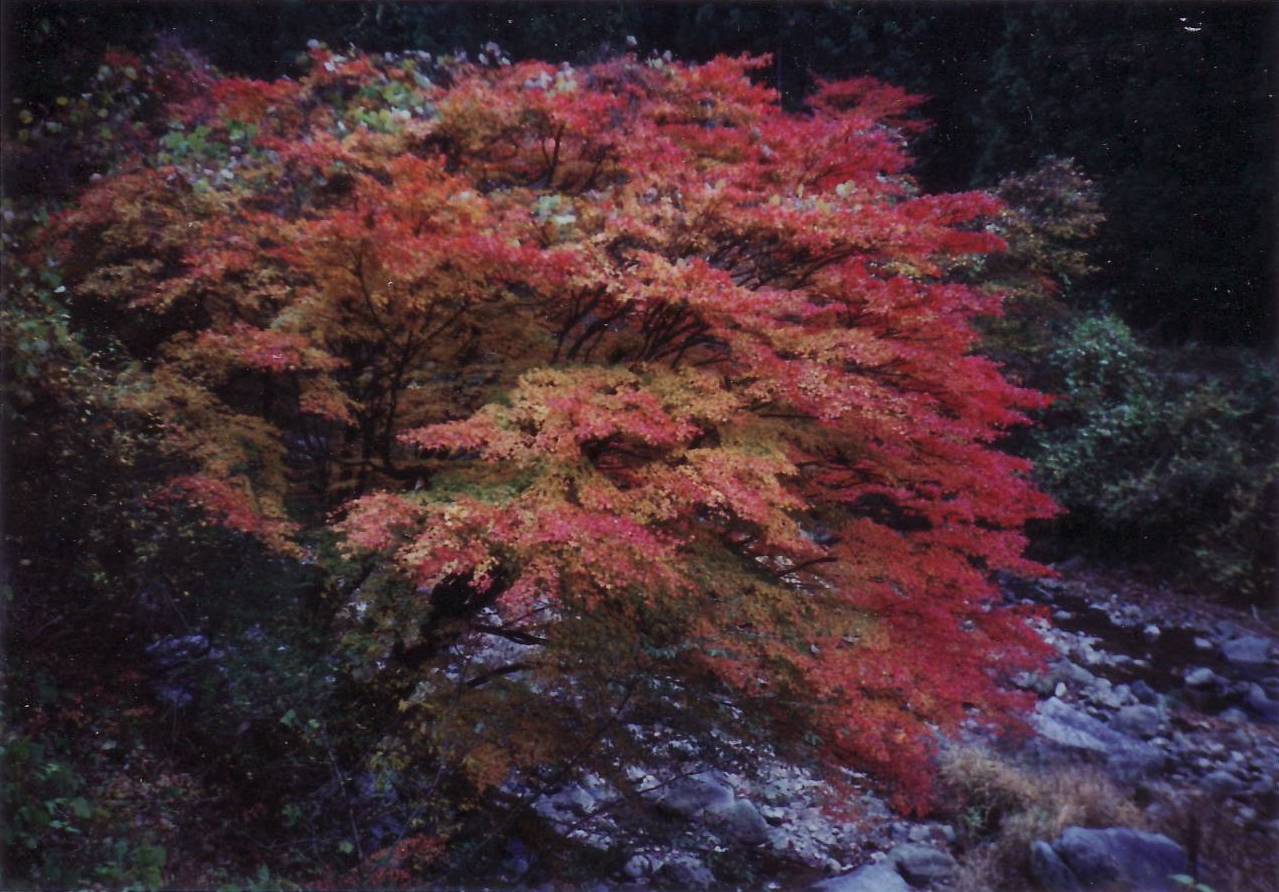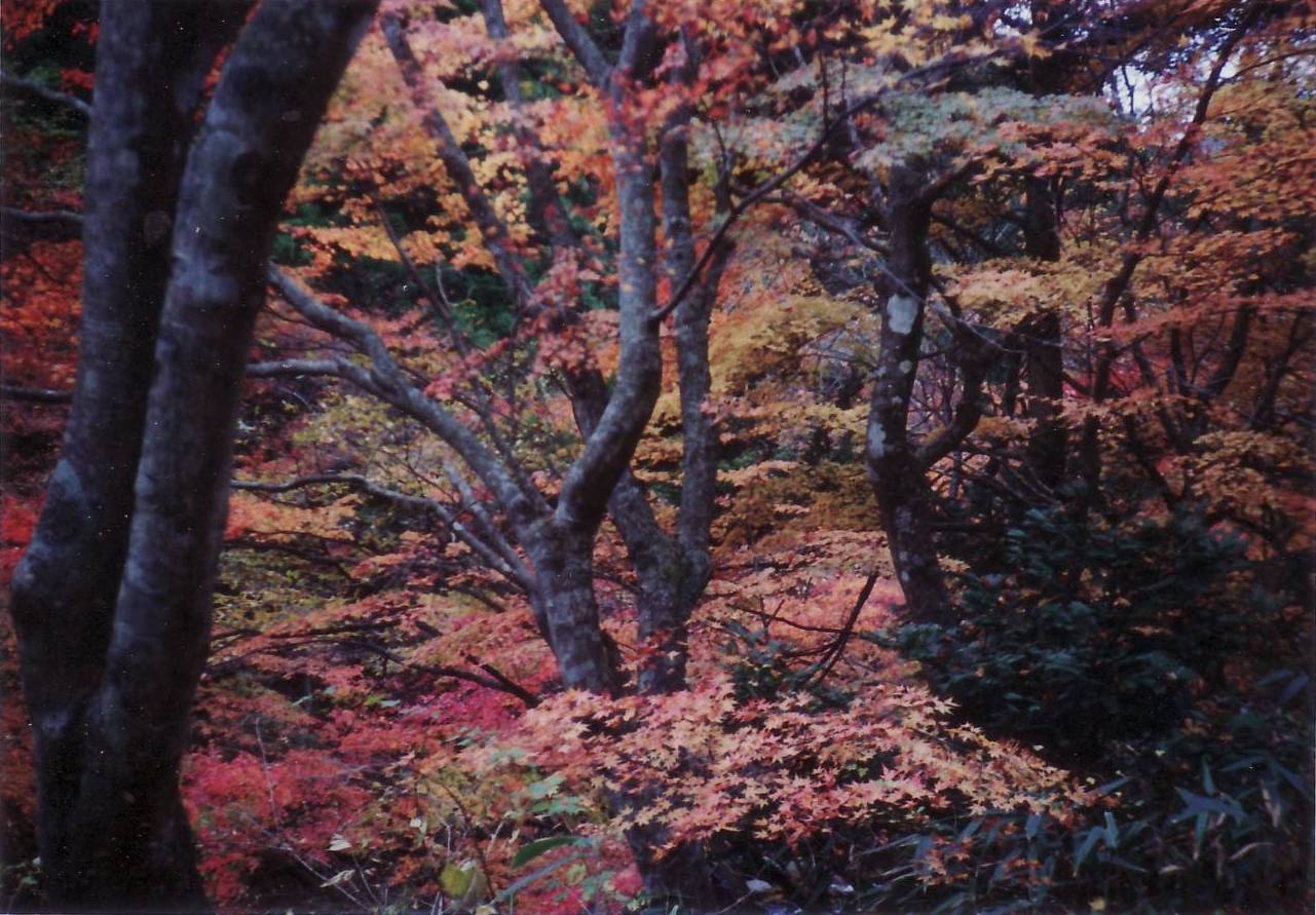 四時川渓谷の紅葉(その2) 上の5年前の1992年11月上旬 天気は高曇り 川沿いの危険な林道にて 人の来ることのない渓谷の紅葉の色はかくの如しです。 しかし、今はここに来ることは危ないかも知れません。 |