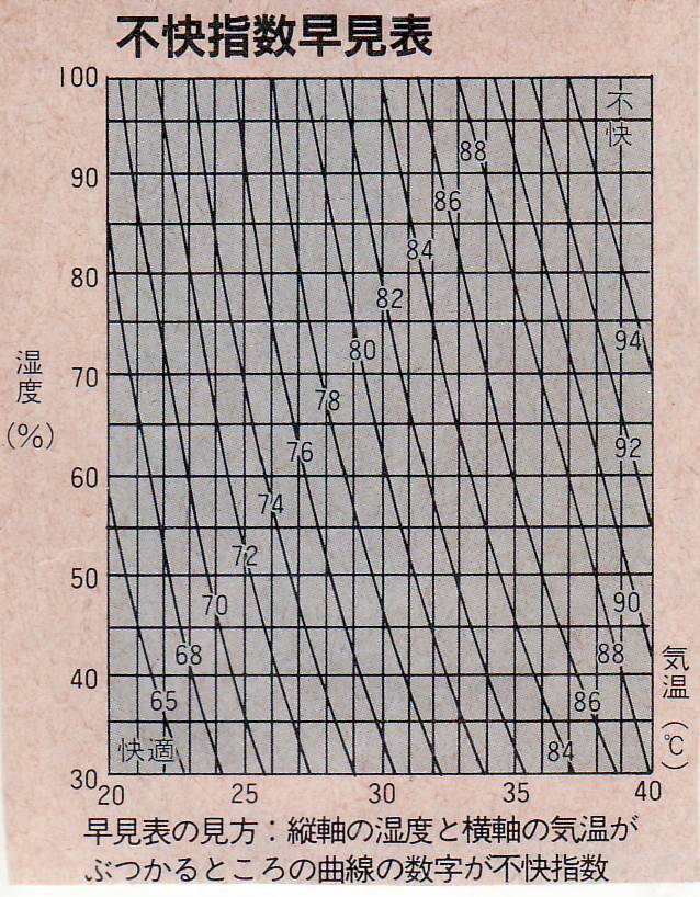 こちらのサイトに、「1957年、米国で蒸し暑さを示す温湿度指数を冷房設計に用いたのが最初。日本では61年夏から使われ始めた。」とあります。日本ではその後、夏の天気予報に不快指数が必ず予報されてきたのですが、どういう訳か、2000年に入ってからは、使われなくなって来ました。夏の体感的な暑さは、気温と湿度の双方で決まるので、気温だけではどの程度の体感的な暑さかは分からないのです。その点、この不快指数は、ずばり、体感的な暑さを表現しています。復活を望む所です。