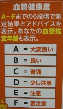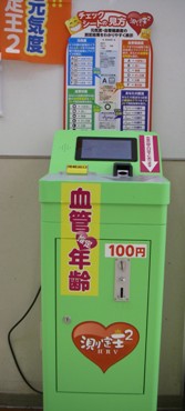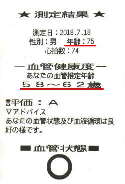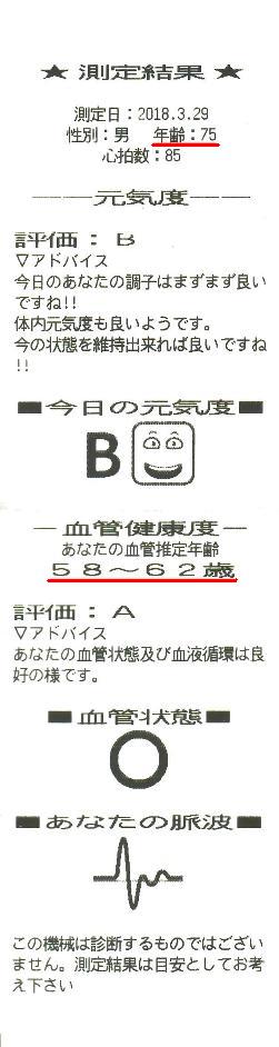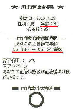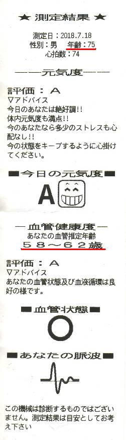 2018年3月29日(木)に福島県白河市のスーパーストア「ベイシア」の軽食コーナーで醤油ラーメン390円を食べました。これぞ、白河ラーメンと言える美味しいラーメンだ。そして、メインの出入り口に戻り、直前にある自動販売機でココアを飲んでいた所、直ぐ隣で、地元の女子中学生たちが血管年齢測定器で血管年齢を測ってキャーキャー笑い合っているではないか。前にここに来た時はこの測定器はなかったのだから、最近、設置されたらしい。女子中学生たちが去った後、僕も測ってみた。右手人差し指を所定の穴に差し込んでから30秒かけて測定するという装置である。その測定結果が、嬉しいことに、下左図のように出ました。私の血管年齢が、私の実年齢75歳よりも約15歳も若いという結果なのです。