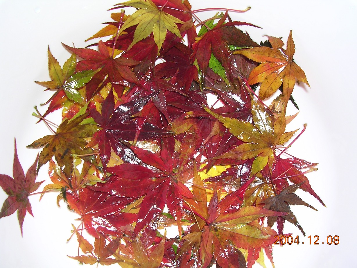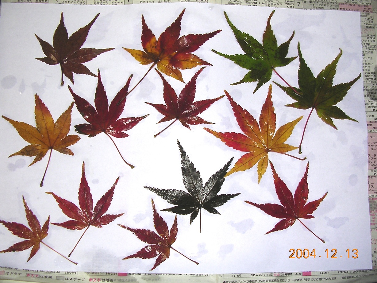 2004年12月上旬に山本暁子様が集めたモミジの落ち葉たちです。綺麗なので載せました。 |