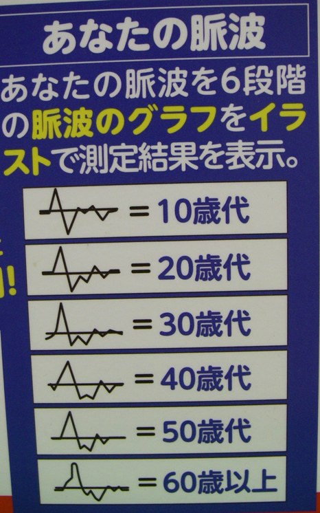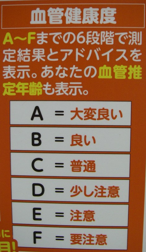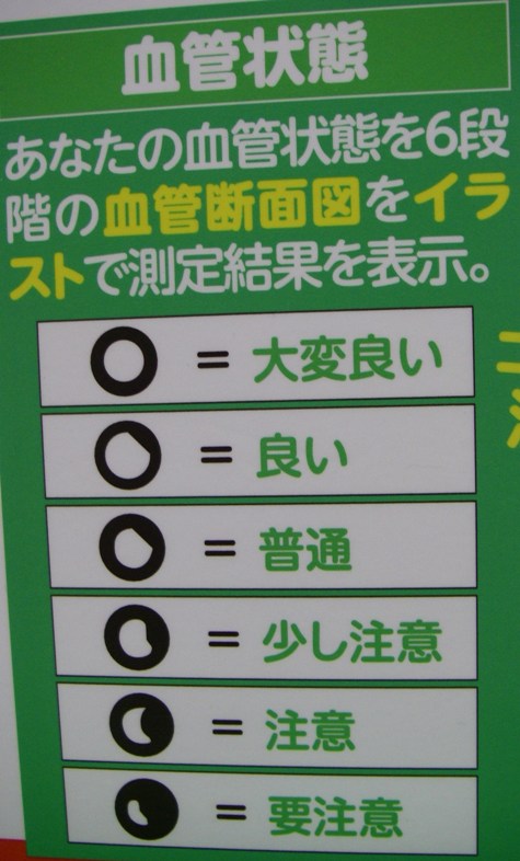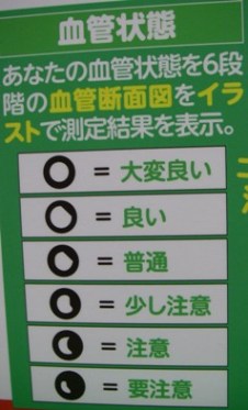 各項目の評価基準を次に示します。特に、下最右の脈波の評価基準と比べると、何と、私の脈波は30歳代を示しています。