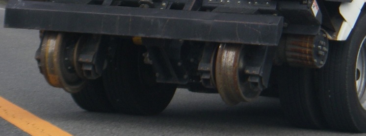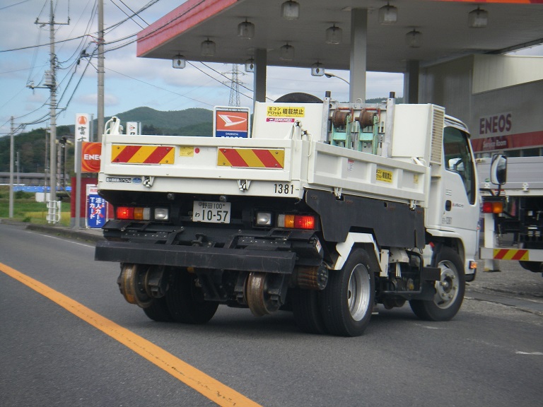 2019年10月16日(水)に福島県東白川郡鮫川村の道の駅「手まめ館」に昼食に行く途中の茨城県常陸太田市里美地区の349号線を車で走っていると、僕の前にはトラックがいます。よく見ると、野田ナンバーの鉄道線路でも走ることのできる鉄道車両も備えた珍しいトラックであることが近づいたときに分かりました。助手席の暁子様に撮ってもらいました。 |