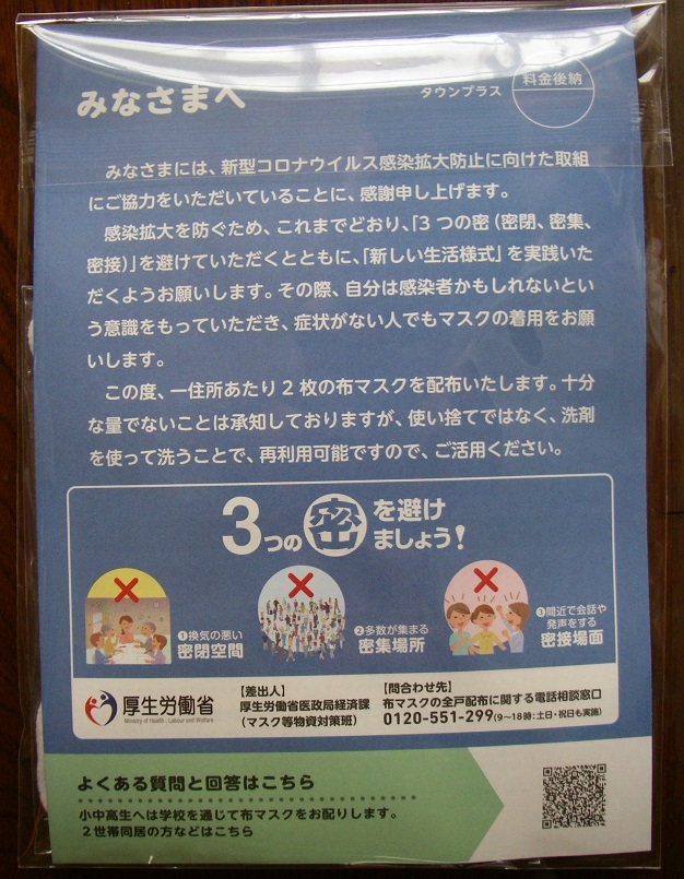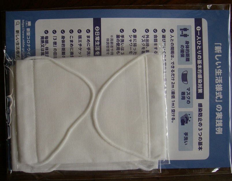 預金通帳を見ると、6月4日に特別定額給付金(一家族計20万円)が振り込まれていた。申請書を郵送してから10日目だ。 緊急事態宣言の解除から2週間経った2020年6月9日に「安倍のマスク」が届いた。見た目はきれい。A様曰く「子供のマスクみたいに小さい」。それが右の写真。 6月18日に日本国内、特に、政府に激震が走った。この日、河井前法務大臣夫妻が公職選挙法違反で逮捕された。現国会議員で法務大臣経験者が逮捕されたのは前代未聞。河井夫妻は国会議員の選挙に当たって、何百万円、計何千万円もの金を広島県議員など100人近くに金を渡した疑い。安倍総理には法務大臣を任命した任命責任が強く求められている。果たして、安倍総理はどのような責任を取るのか? 8月28日(金)夕方、安倍総理大臣が腫瘍性大腸炎再発のため、突然の総理大臣の辞任を表明した。世の中、それを予測していた人、驚きを示す人、様々だ。 この項の最初に、「私はコロナに感染しているかもしれない。」と書きましたが、よく考えるに、多分、感染していないと思います。私も無責任な男だ。
