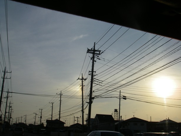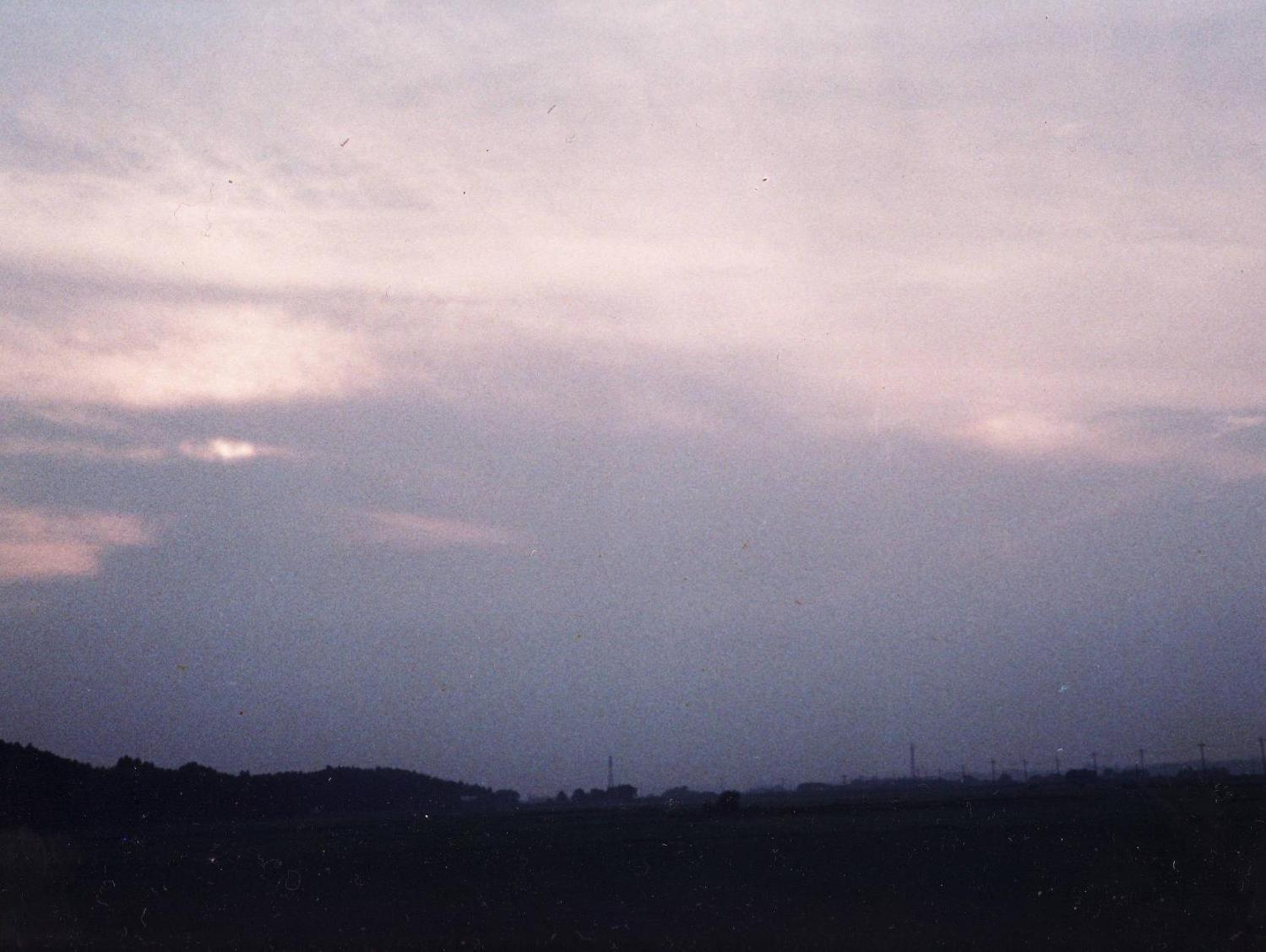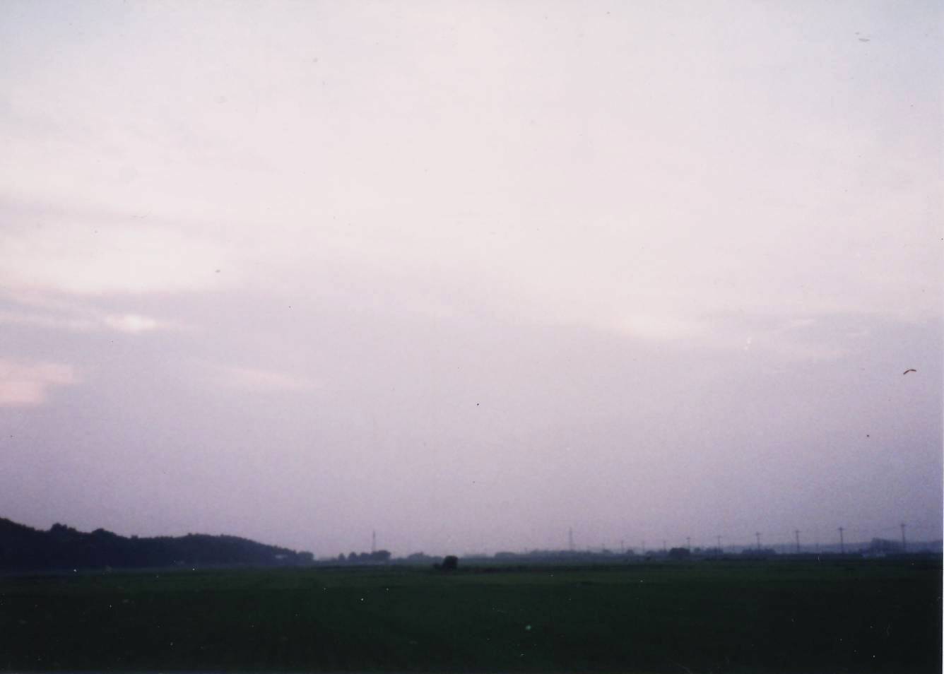 (1) 1990年8月、茨城県那珂市本米崎の久慈川近くの田圃を車で走行中に、ふと西日を見ると、太陽が2つ見えるではありませんか。どちらが本当の太陽かが瞬時には判断できませんでした。車を降りて撮った写真がこれです。西の空(栃木県側)には積乱雲(雷雲)があって、このため高度1万メートル付近に高層雲が発生し、この中の氷晶が太陽光線を屈折させて、太陽の像を作るためと、すぐに判断されました。この翌年に、同じ現象の写真がスクープとして新聞を飾りましたが、もし、私が新聞社に連絡していれば、と一寸悔やまれました。 |