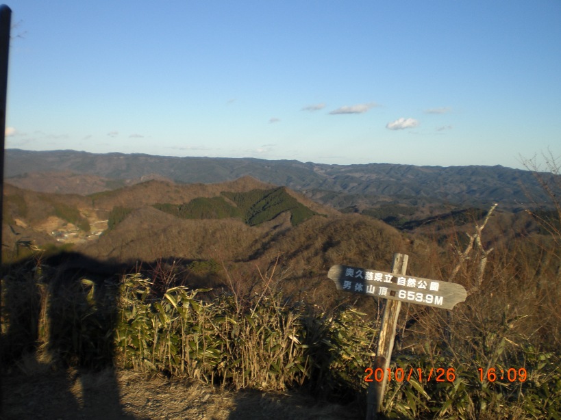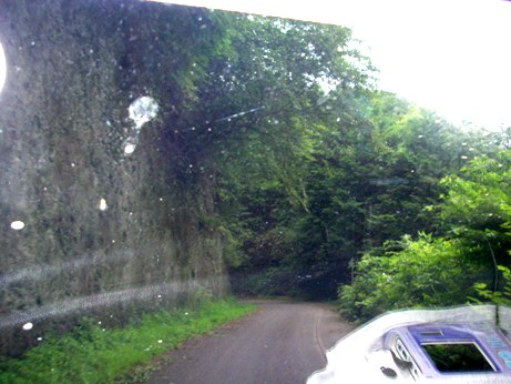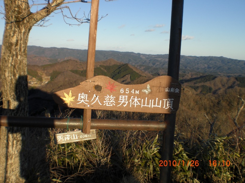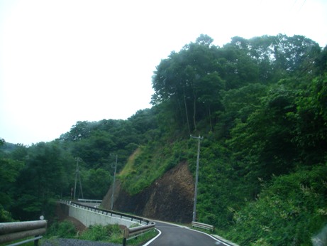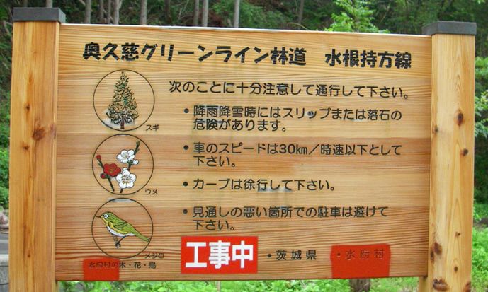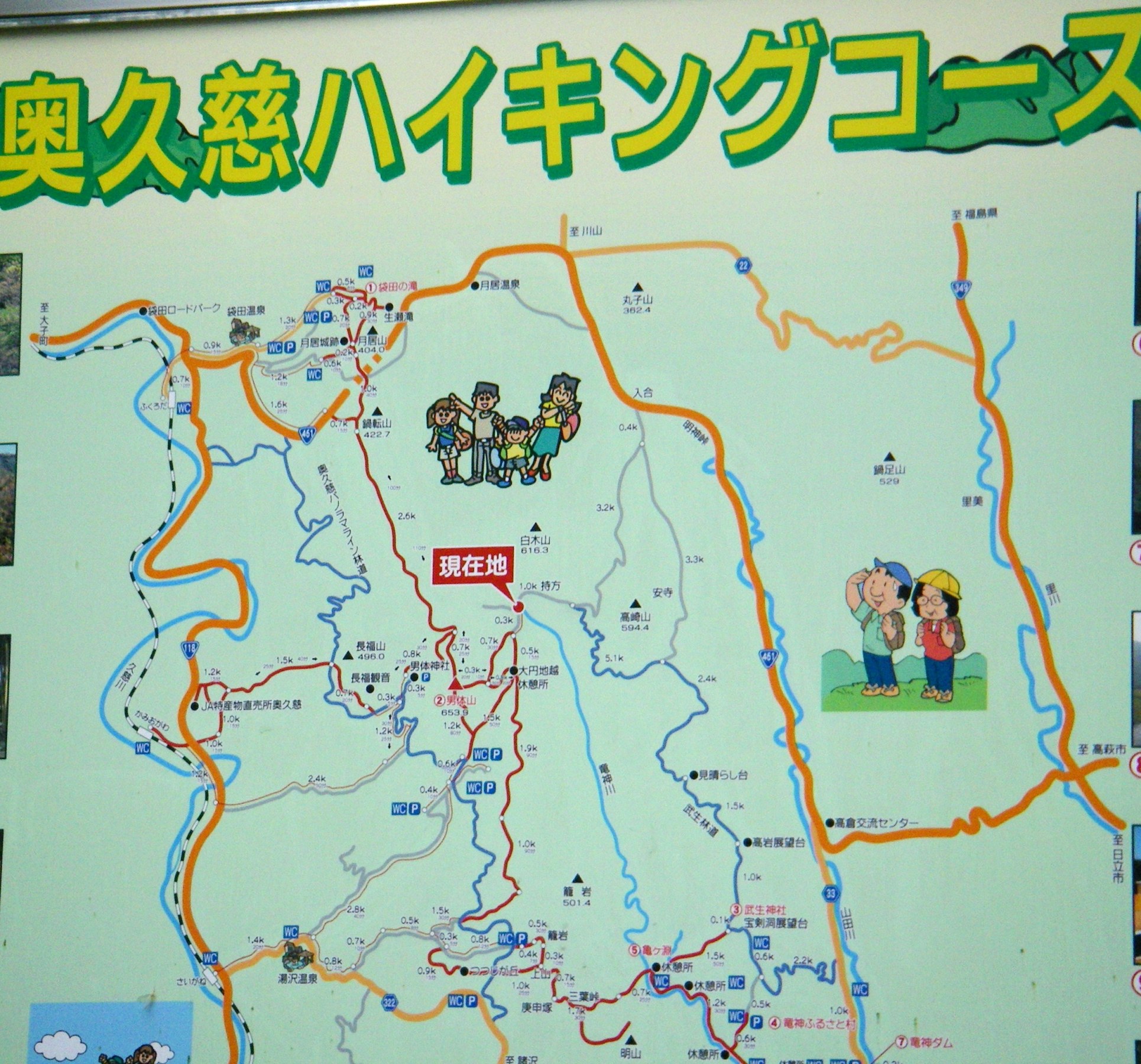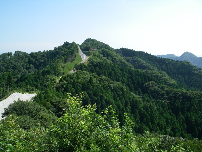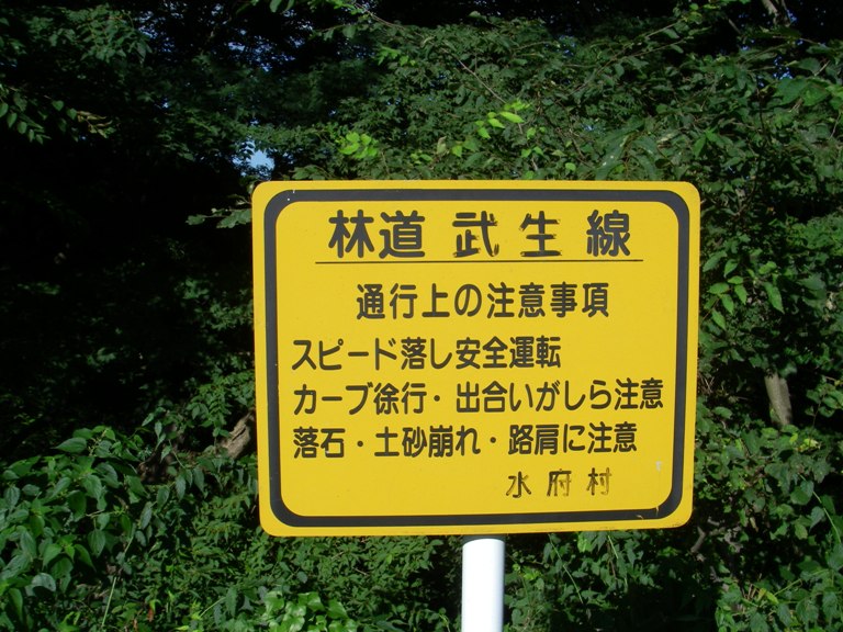 普通は、上記に通ったコースを反対に辿ります。それは、近年有名になった常陸太田市の竜神大吊橋の入り口を通過して北上し、さらに、竜神ダムの入り口をも通過して約1キロの右側に、「武生神社、武生山、竜神ふるさと村」と書かれた大きな看板があります。ここに、人家の間の右折する細い道があり、これが武生林道の入口です。最初の100メートルは細いですが、登るにつれ、次第に道幅が広くなります。全コース舗装です。